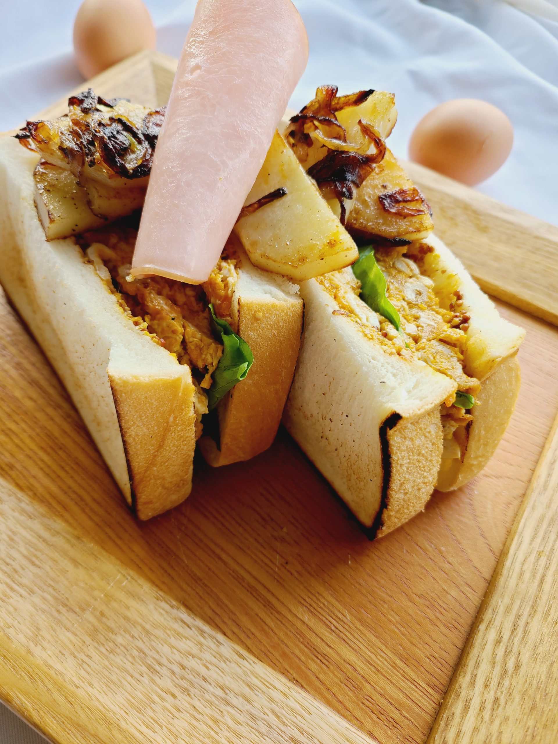 たまごサンドにじゃが芋とオニオンソテーを添えました。