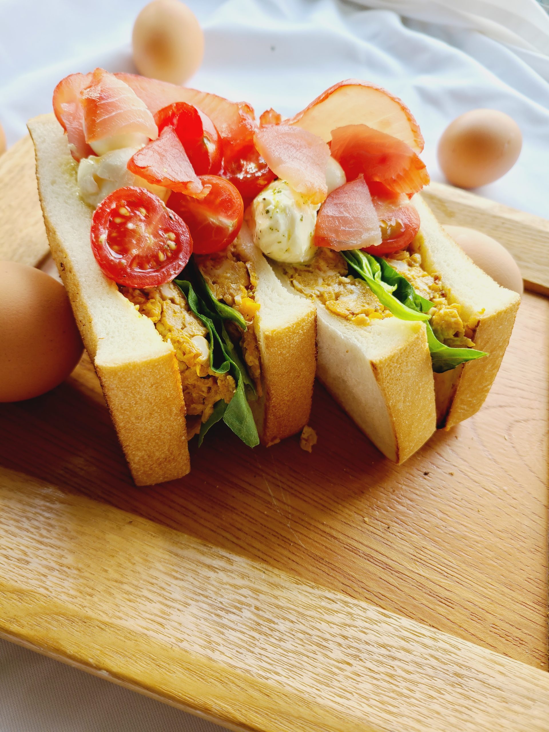 たまごサンドにマグロハムとモッツァレラ、トマトをトッピングしました。
