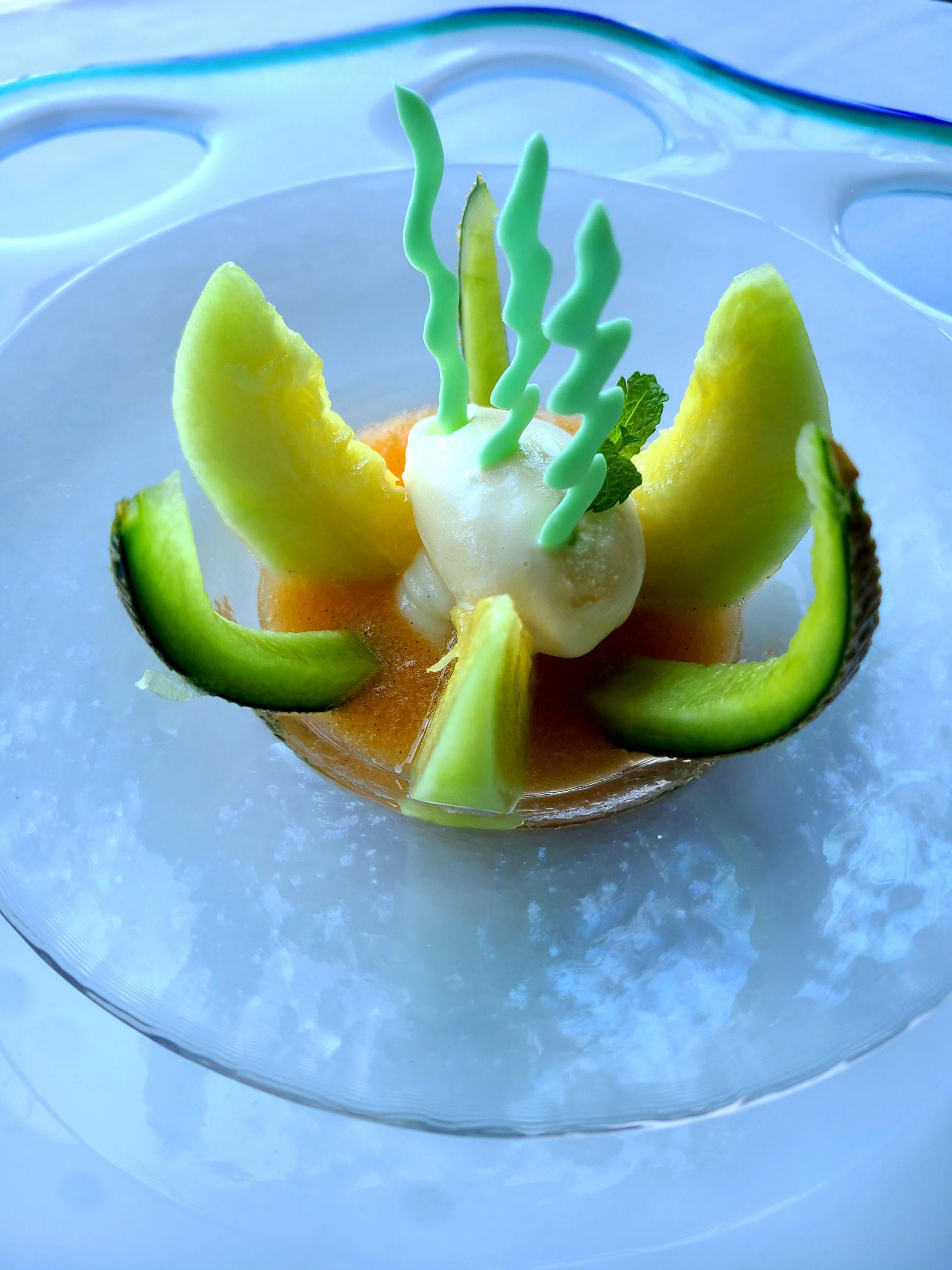 メロンのスープ仕立てバニラのブランマンジェとバニラアイスと共に。